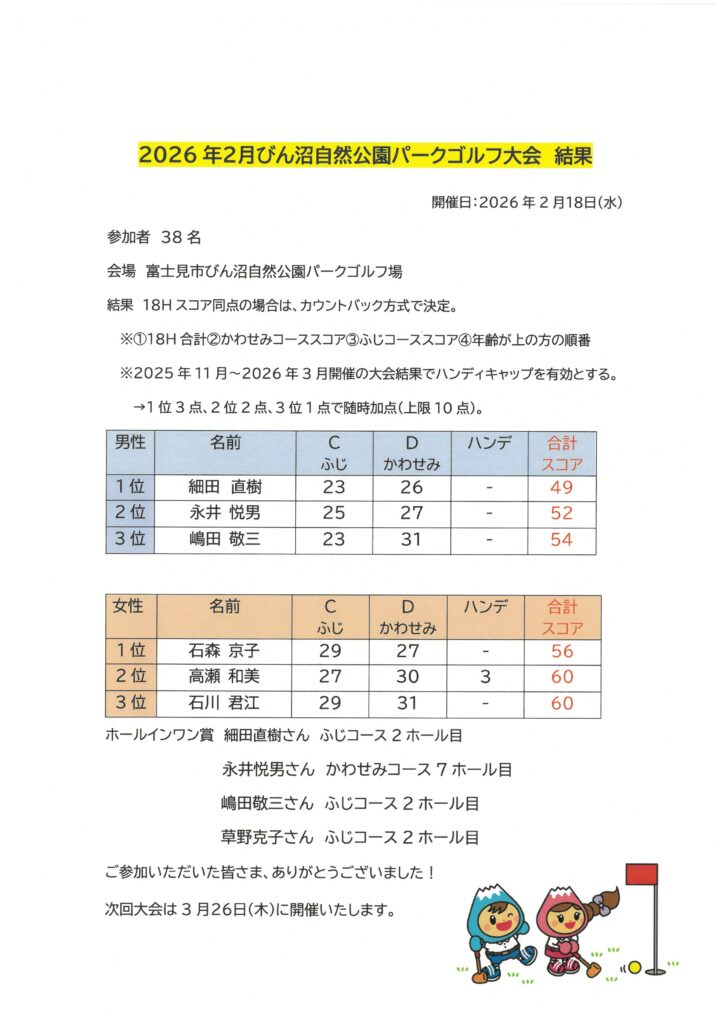 2026年2月18日(水)に開催いたしました、びん沼パークゴルフ大会の結果と大会の様子をご紹介いたします。