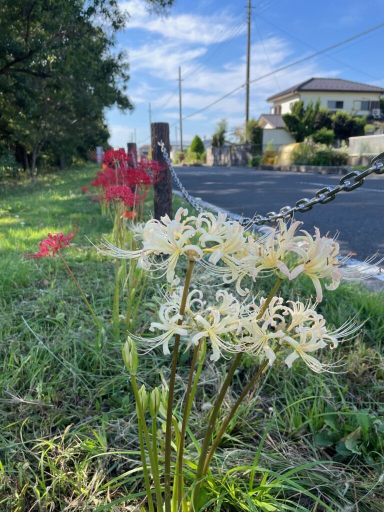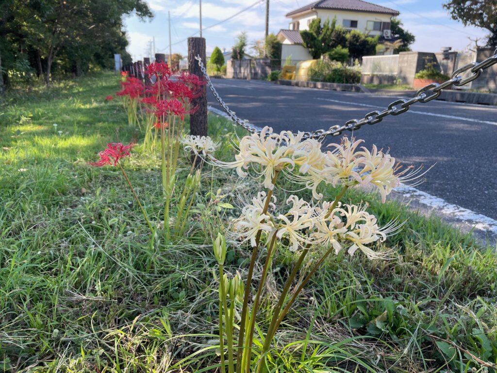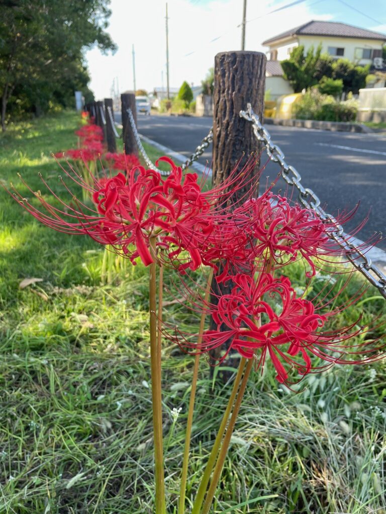現在、公園前の道路沿いにて彼岸花が満開となっております。