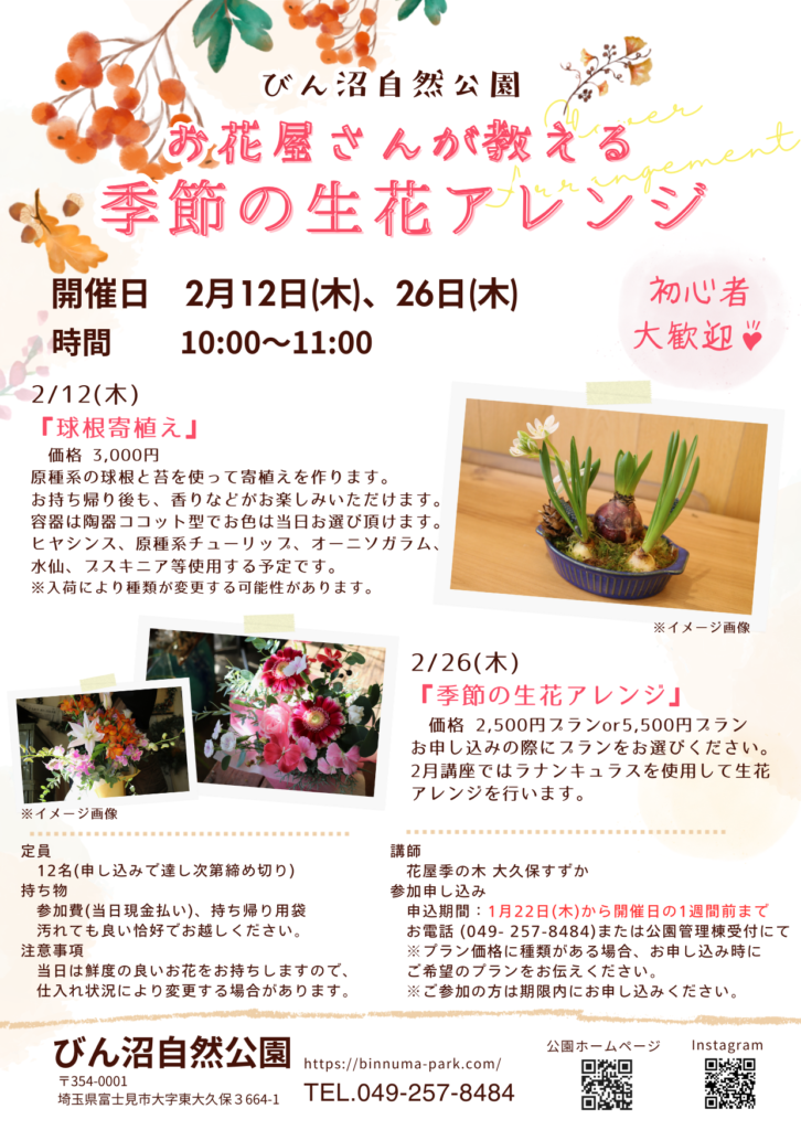 びん沼自然公園の多目的室にて1月より開催している「お花屋さんが教える季節の生花アレンジ教室」の2月開催分のお知らせです。