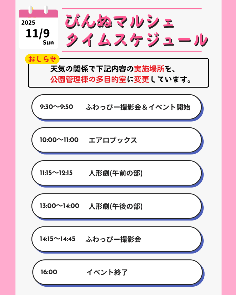 ↓ 変更後タイムスケジュール(ふわっぴー撮影会、エアロブックス、人形劇)