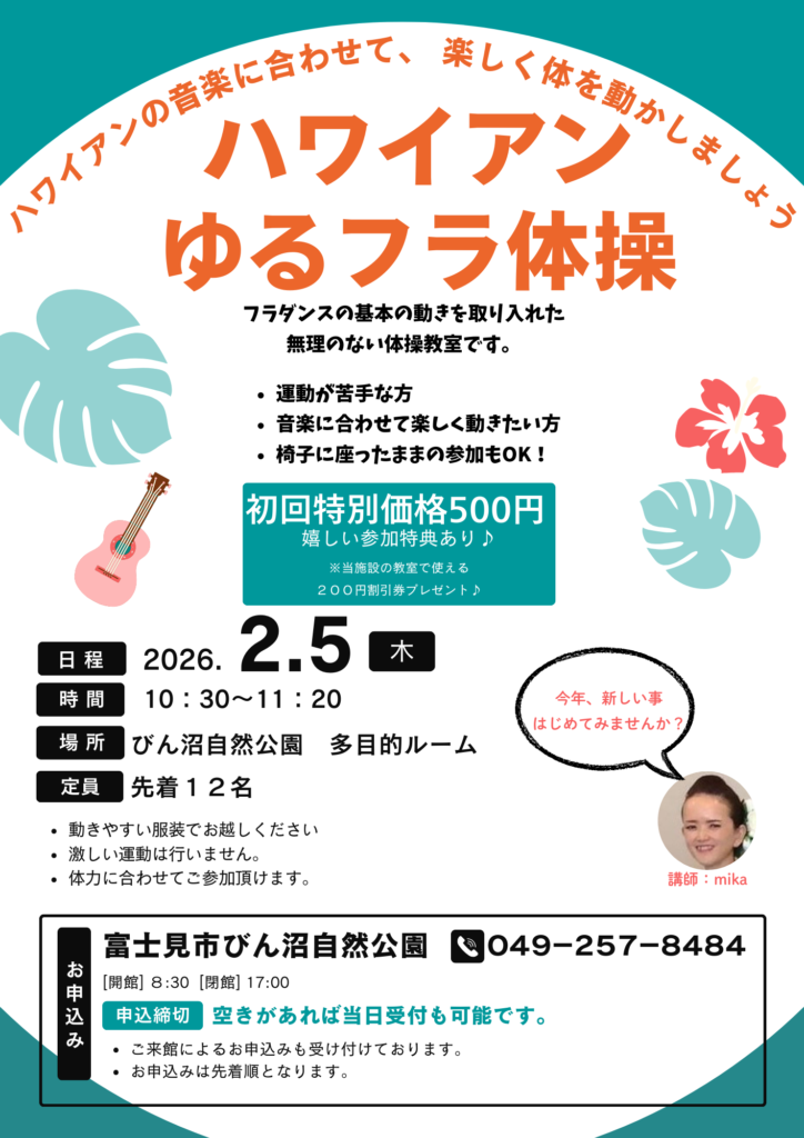 びん沼自然公園管理棟の多目的ルームにて「ハワイアンゆるフラ体操」を開催いたします!